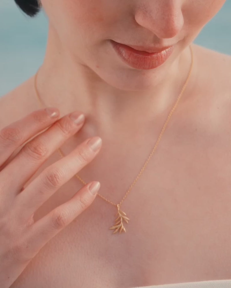 Elaia is een delicate olijftak-hanger, zacht gebogen en hangend aan een dunne ketting – een botanisch symbool van vrede en veerkracht.