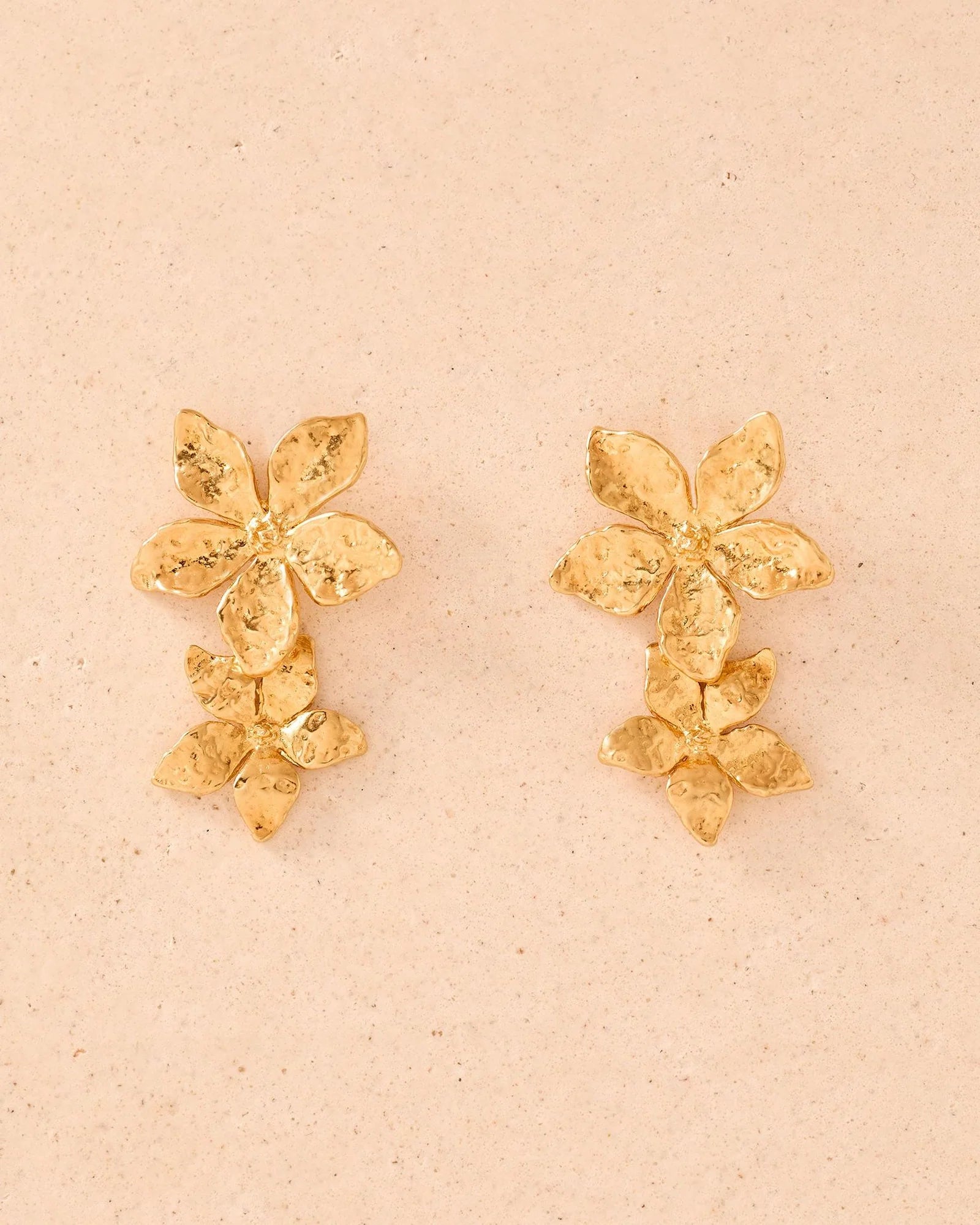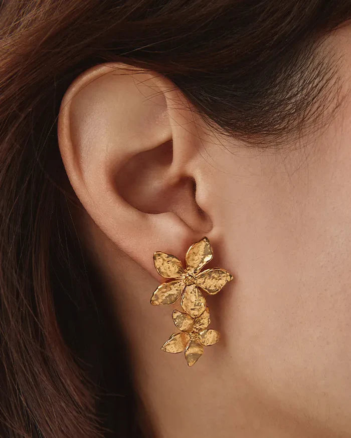 De Thalla bloemenoorbellen hebben twee subtiel gehamerde hangers in de vorm van een bloem met vijf bloemblaadjes en minutieuze details.