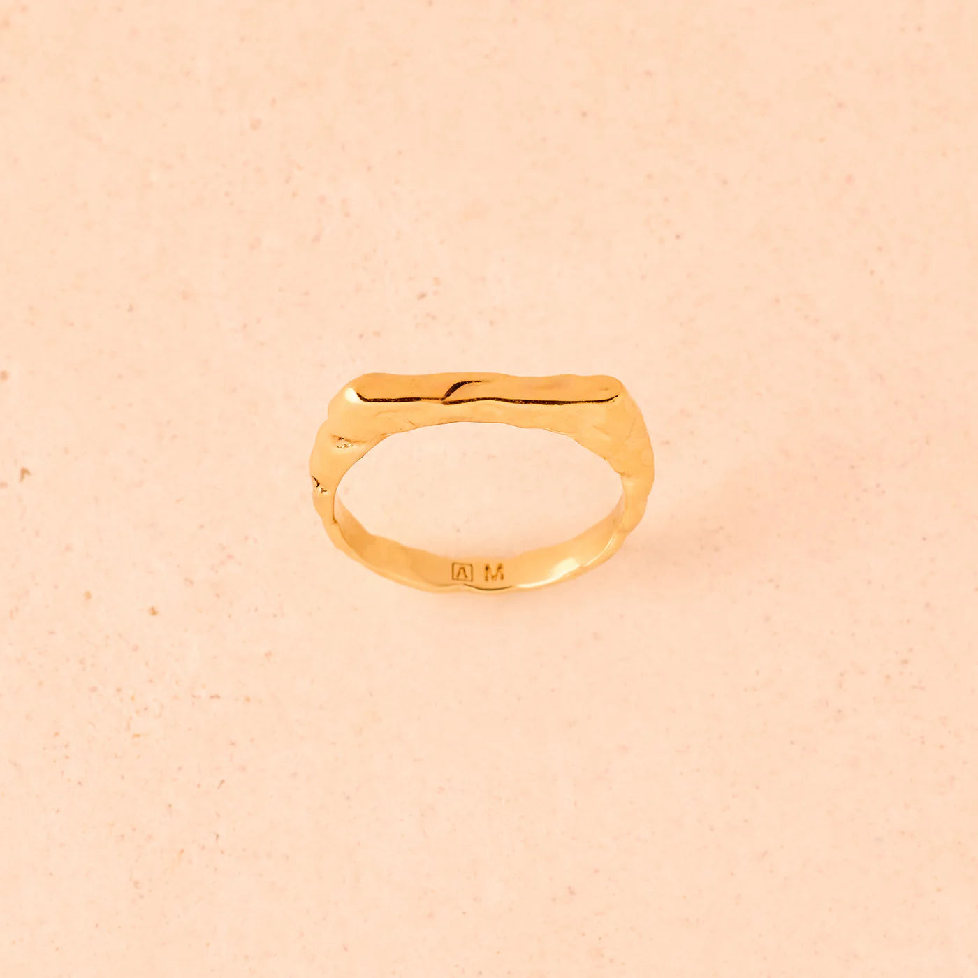 The Octavia mini ring, a hammered rectangular signet ring, is a redesigned ancient artefact and is slim, structured and minimalist.